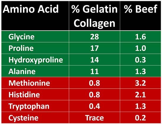 • A primer on collagen sources — For your body to produce collagen, your body will need the right amino acids from animal parts that have them. That’s because red meat alone won’t give your body the amino acids (highlighted in green below). In addition, a high intake of amino acids from red meat (highlighted in red below) can promote inflammation, as well as suppress thyroid function and metabolism.14