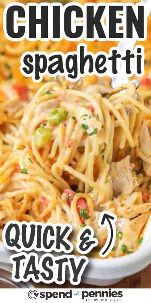 This chicken spaghetti is a creamy, cheesy comfort food that is baked until bubbly. It’s an easy casserole that comes together fast, with enough to feed a crowd.