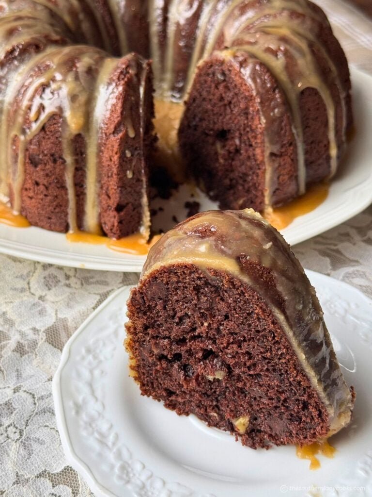 Cook in preheated 350 degree oven for 55 – 60 minutes. Remove from oven and let cool for 10 minutes before removing from pan. Cool completely before adding caramel frosting.