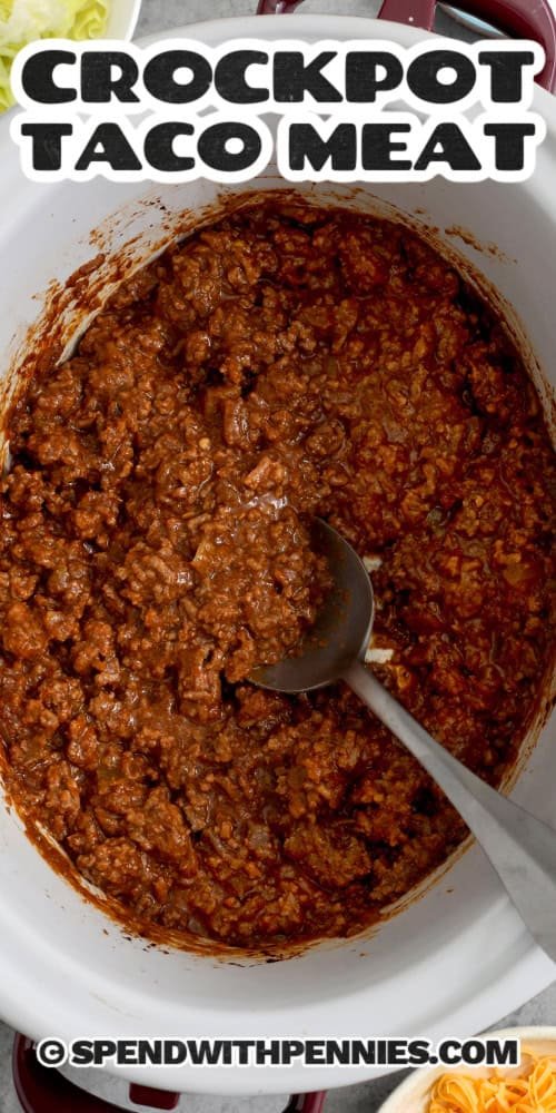 Overhead of a crockpot with saucy Taco meat and a spoon with text