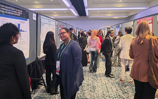 Jeevisha Bajaj, PhD, of University of Rochester, discussed the role of the microenvironment in the context of leukemia, elucidating some temporal changes in composition of the leukemic microenvironment and how the bone marrow niche and secreted metabolites support acute myeloid leukemia (AML) growth. Using single‑cell transcriptomics and functional genetic models, Bajaj and team showed that taurine produced by cells of the osteolineage in the bone marrow supports AML growth by regulating glycolysis and mTOR signaling in leukemic cells. The researchers found that expression of CDO1, which promotes the production of taurine, increases with disease progression; that blocking taurine production in osteolineage cells impairs leukemia progression; and that inhibition of the taurine transporter SLC6A6 blocks AML growth in vivo. These findings helped establish taurine uptake as a microenvironment-related dependency in AML.