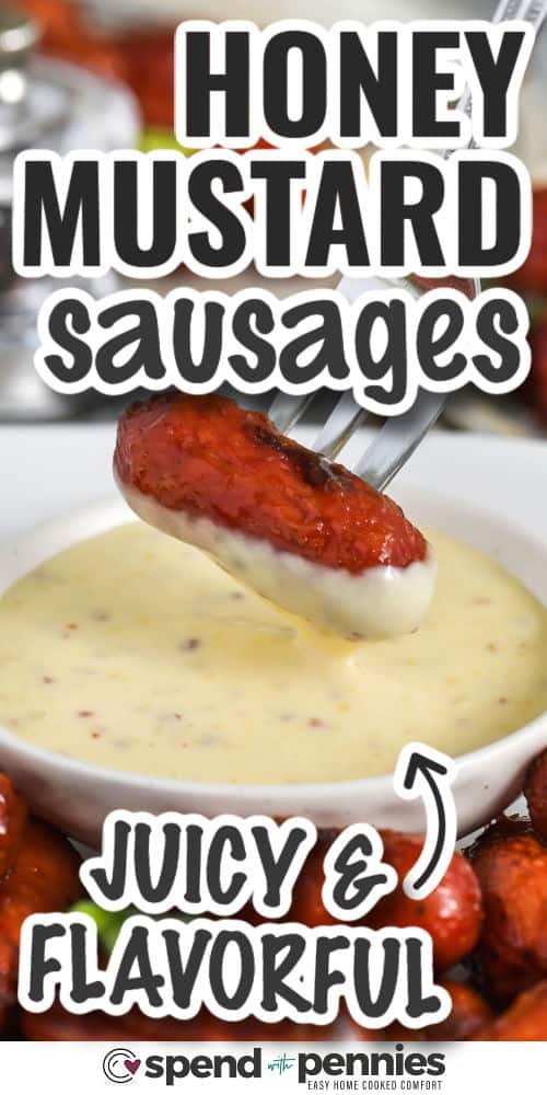 sweet and savory Sticky Honey Mustard Sausage with writing
