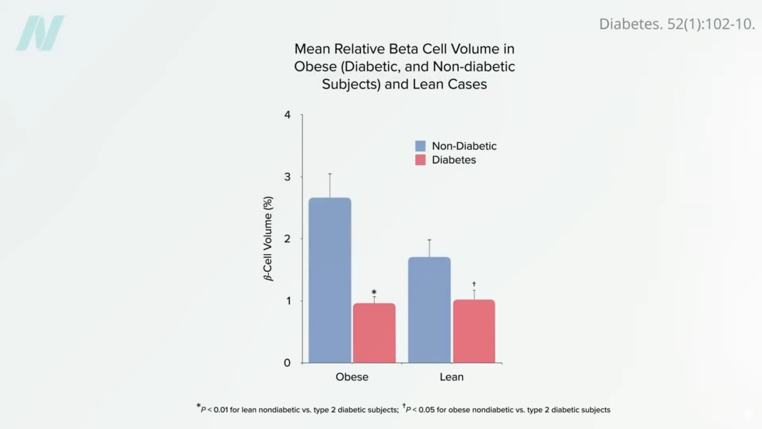 Caloric restriction works by first mobilizing fat out of the liver. Type 2 diabetes is thought to be caused by fat building up in the liver and spilling over into the pancreas. Everyone may have a “personal fat threshold” for the safe storage of excess fat. When that limit is exceeded, fat gets deposited in the liver, where it can cause insulin resistance. The liver may then offload some of the fat (in the form of a fat transport molecule called VLDL), which can then accumulate in the pancreas and kill off the cells that produce insulin. By the time diabetes is diagnosed, half of our insulin-producing cells may have been destroyed, as seen below and at 3:36 in my video Bariatric Surgery vs. Diet to Reverse Diabetes. Put people on a low-calorie diet, though, and this entire process can be reversed.
