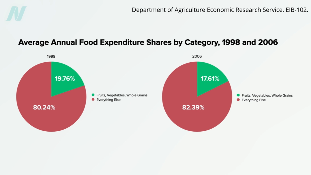 Theoretically, a whole food, plant-based or vegan diet that excluded refined grains, white potatoes, hard liquors, added oils, and added sugars could achieve a perfect score of 100. Lamentably, most Americans’ diets today might be lucky to score just 20. What’s going on? In 1998, our shopping baskets were filled with about 20% whole plant foods; more recently, that has actually shrunk, as you can see below and at 2:49 in my video Plant-Based Eating Score Put to the Test.
