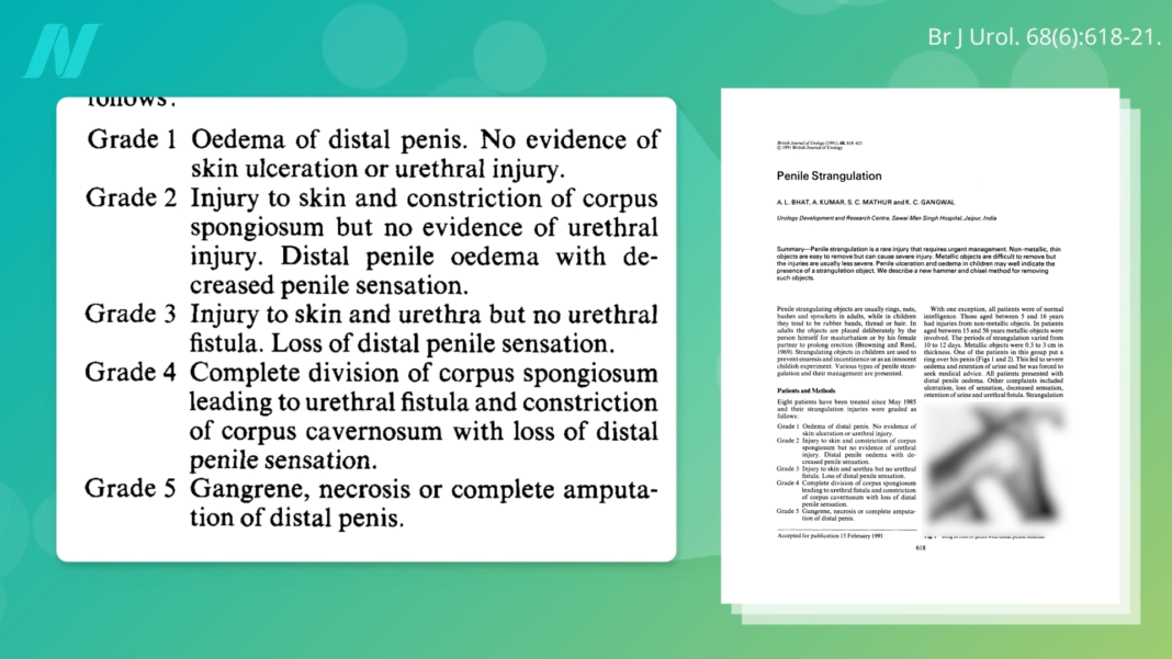 That got me curious. Evidently, penile entrapment is so common that there is an entire grading system that emergency room doctors can use, as you can see here and at 1:21 in my video Mixed Nuts Put to the Test for Erectile Dysfunction. If a drill isn’t available, the surgeons advised, “a hammer and chisel may be used to remove nuts.”