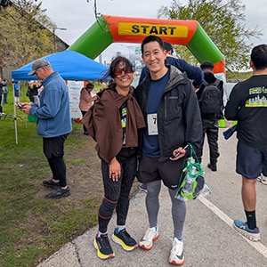 Subhasree Basu, PhD, (left) poses with fellow Johnson & Johnson scientist Doug Yamada, PhD, (right) at the 2025 AACR 5K.