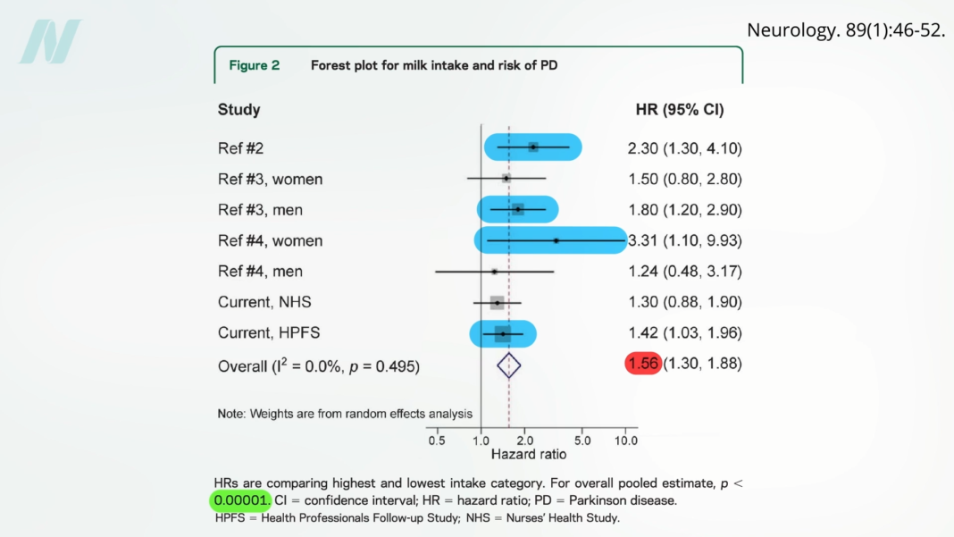 Parkinson’s disease is a neurodegenerative brain disorder that affects millions of people. What causes it? Well, if you look at lifestyle factors associated with Parkinson’s disease, dairy consumption is the strongest dietary factor associated with an increased risk of Parkinson’s disease. In fact, dairy products are the only food group consistently linked with a high risk of developing Parkinson’s. Five large prospective studies have confirmed the link. This includes the two Harvard cohorts, the Nurses’ Health Study and the Health Professionals Follow-up Study, which followed more than 100,000 people combined for decades in “the largest analysis of dairy and PD [Parkinson’s disease] to date,” analyzing more than 1,000 newly diagnosed cases. All the studies found a link between dairy and Parkinson’s, with most finding a significant link—about a 50% increase in risk overall in those drinking the most milk compared to those drinking the least, at a p-value below 0.00001, meaning there’s less than a 1 in 100,000 chance you’d randomly get a finding that extreme. You can see this in the chart below and at 1:13 in my video, The Role Milk May Play in Triggering Parkinson’s Disease.