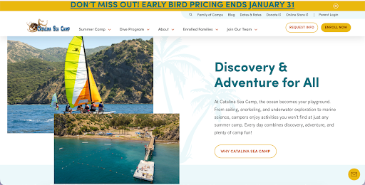 | Catalina Sea Camp | One week, 2.5 weeks | Sailing, snorkeling, kayaking, scuba diving and marine science labs | Catalina Island, California | Eight to 17 |
